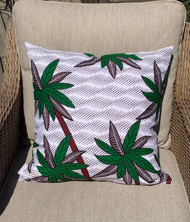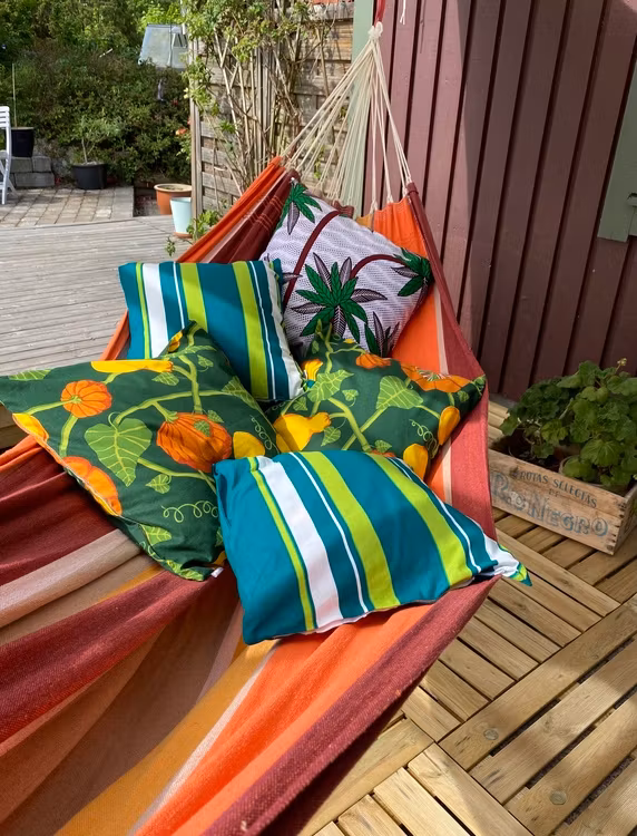 Somrigt kuddfodral till trädgårdssoffan eller hängmattan? Bomull från Senegal. Samma tyg på fram- och baksida. Knäppes med kardborreband nertill.